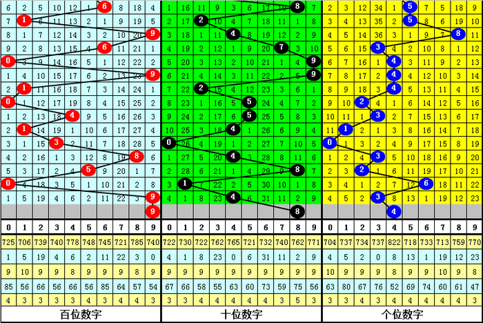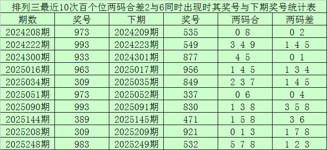 百个位合差分析:上期奖号百个位开出93组合,两码合为2,两码差为6,最近10次百个位两码合2与两码差6同时出现时,其奖号和下期奖号分别为: