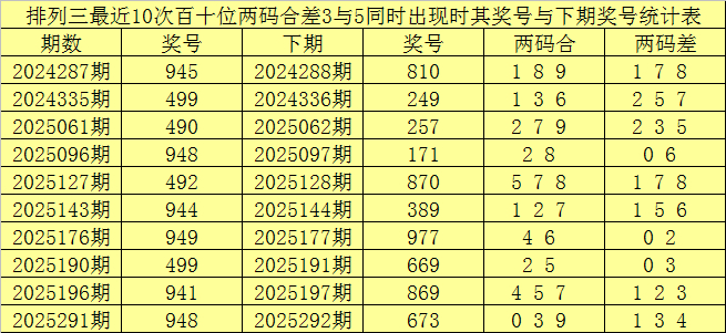 百十位合差分析:上期奖号百十位开出94组合,两码合为3,两码差为5,最近10次百十位两码合3与两码差5同时出现时,其奖号和下期奖号分别为: