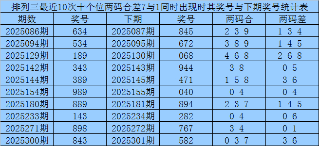 十个位合差分析:上期奖号十个位开出43组合,两码合为7,两码差为1,最近10次十个位两码合7与两码差1同时出现时,其奖号和下期奖号分别为: