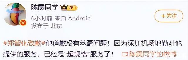 但是陈震一则消息再次把郑智化推向风口浪尖。 陈震作为机场尊贵的VIP客户,他经常坐飞机,看到郑智化发布的消息。 在看监控画面的消息,他发出自己的感受,他也没想到自己的感触会让郑智化再登热搜。
