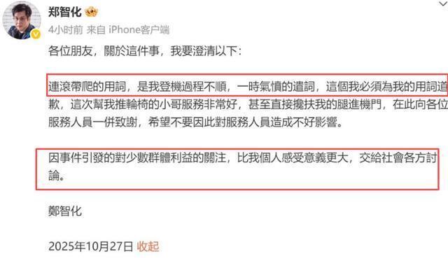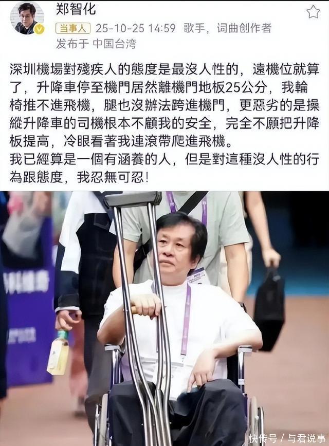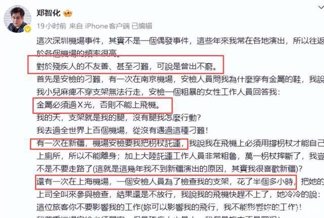 貌似登机对于残疾人来说确实不方便,因为我们都体验不到他当时的感觉。 所以我们网友、我们这些旁边者也都有错。 而事件的本人郑智化也有错,他身为公众人物他大夸其词,把事情带偏。