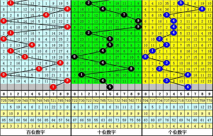 百位分析:该位最近10期出现范围在0-9之间,波动了10个点位,波动范围较大,上期开出号码9,上升了9个点位,本期看好该位号码下降。另外该位最近10期大小比为4:6,大号走冷,本期看好大号回补,参考号码7。