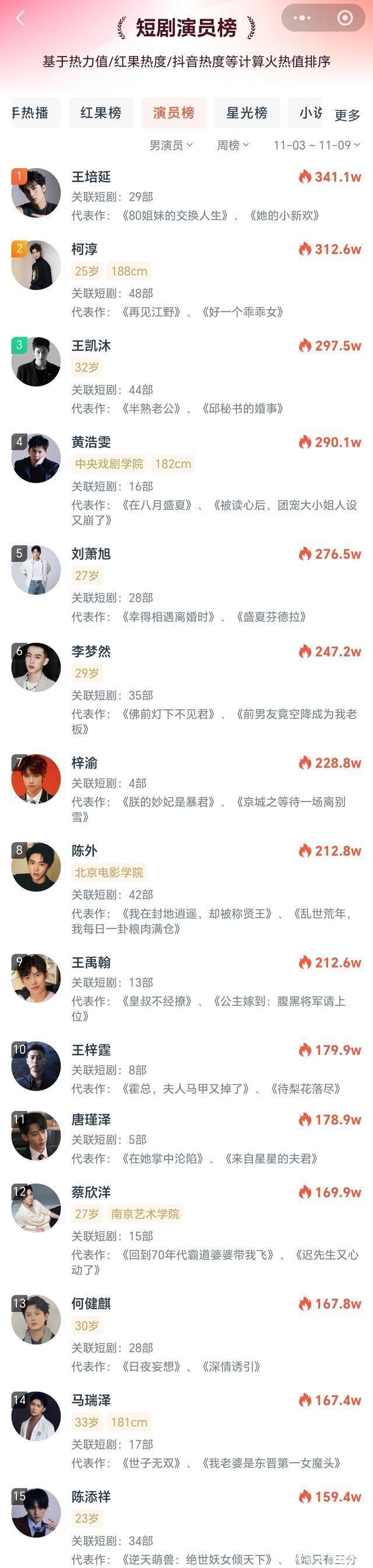 咱先唠唠这几位新面孔有多绝。 柯淳能登顶是真杀疯了,要知道之前短剧圈里陈添祥的霸总、姚冠宇的民国疯批可都是热度扛把子,结果这次直接被柯淳超车。